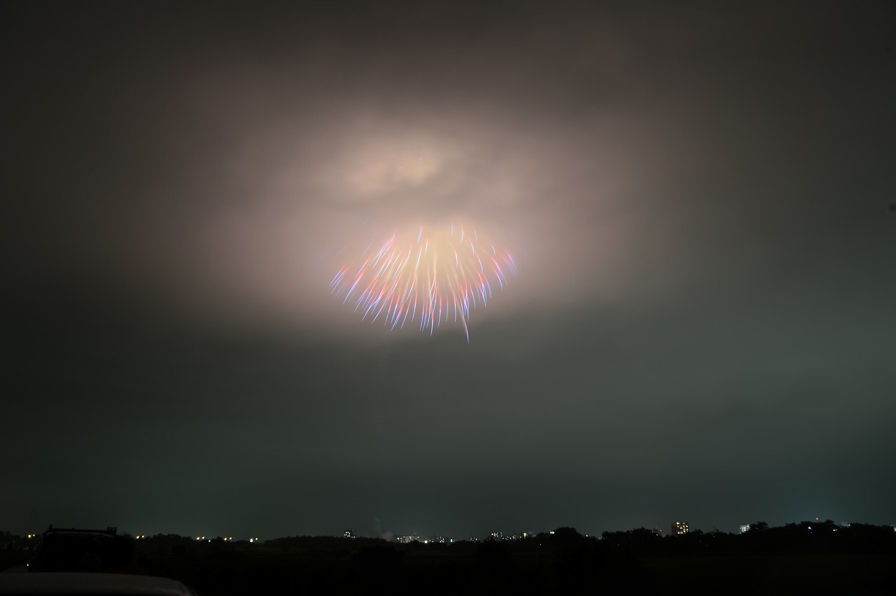 雨が道路を濡らす状況で半信半疑で熊谷に花火を撮りに行きました。